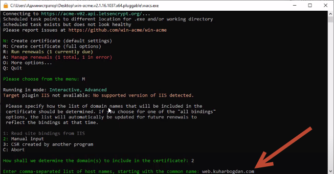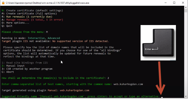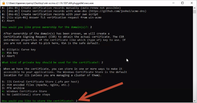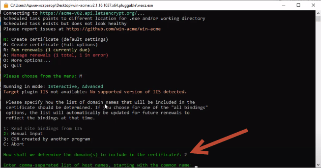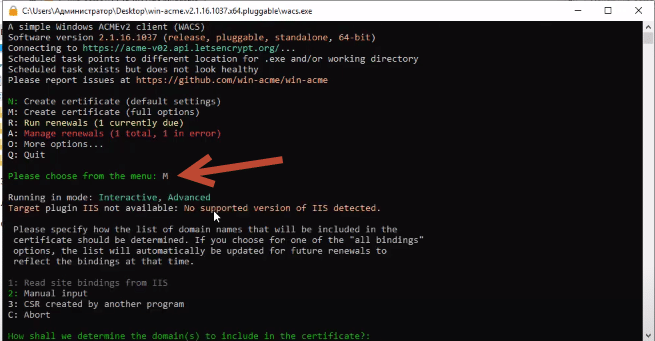 Теперь запускаем утилиту «Win-acme» (От имени Администратора) для создания этих сертификатов в директории «Cert».