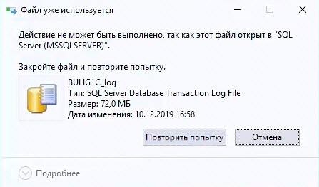 К слову если сервер СУБД работает, плюс база «Онлайн» тогда если предварительно не сделать Detach, или не перевести базу в offline (так называемый автономный режим), скопировать лог или базу мы не сможем, получим ошибку что файл используется!
