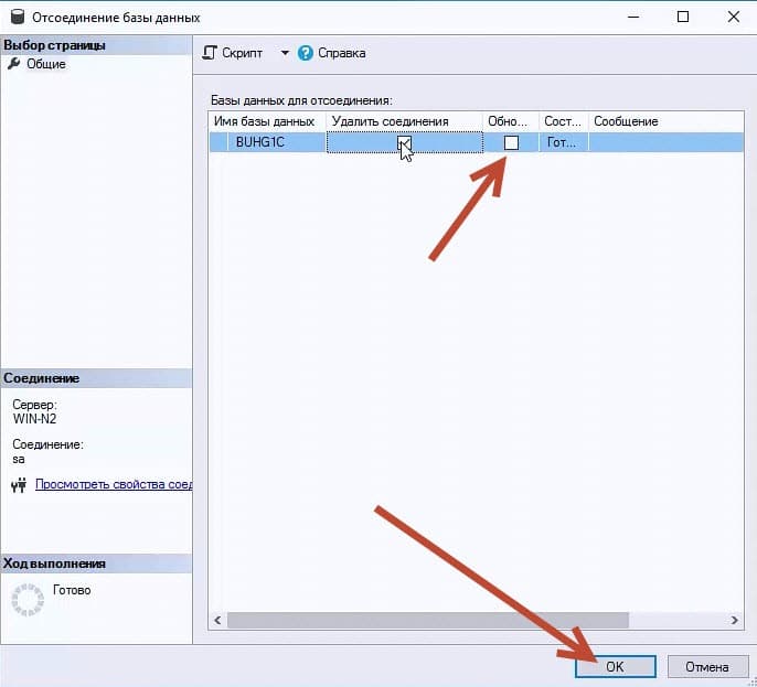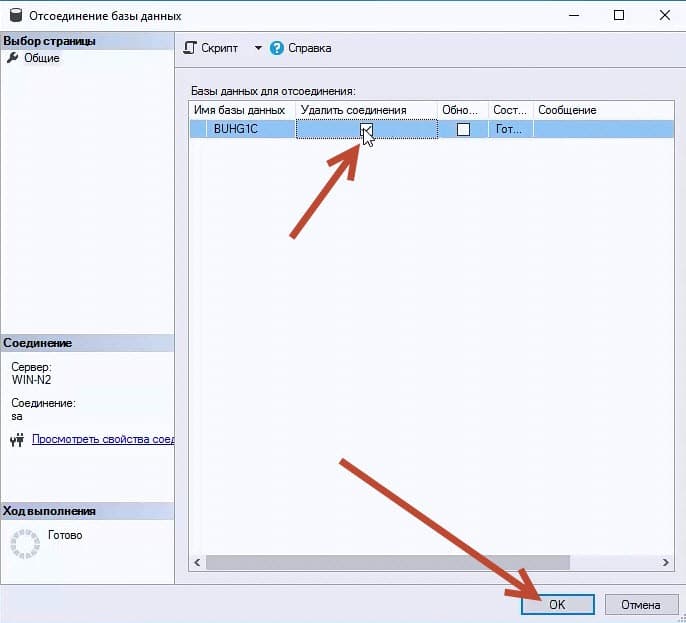 Затем в окне отсоединения базы следует поставить птичку «Удалить соединения».