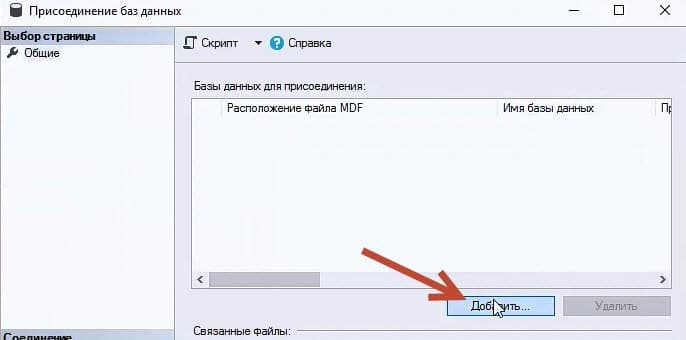 Затем в окне «Присоединения базы» клик по кнопке «Добавить»