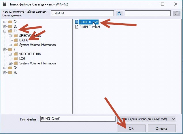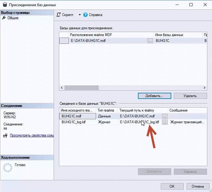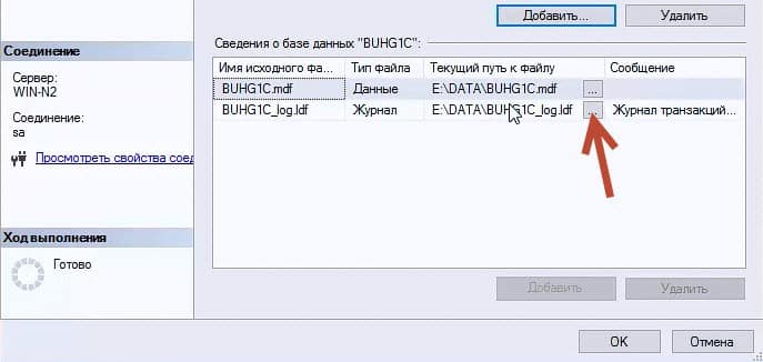Сперва укажем расположение файла mdf (база). У меня это диск E:\DATA\BUHG1C.mdf