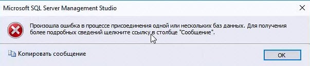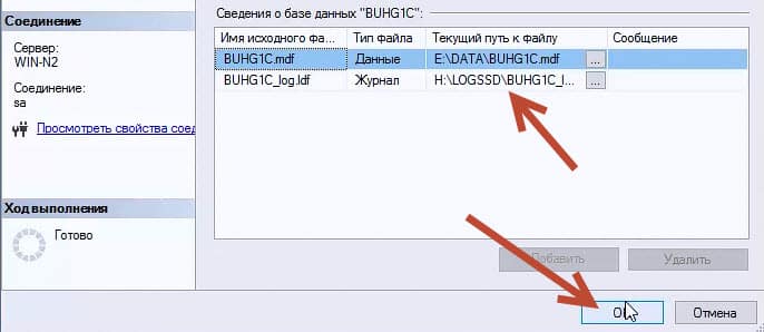 После того как мы кликнем по кнопке «ОК» увидим в окне ниже что MS SQL предполагает, что расположение файла лога соответствует расположению базы mdf, но конечно, лога по указанному месту уже нет, мы его переместили на другой диск, и теперь его следует указать вручную!