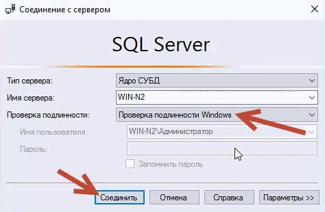 Просто выбираем «Проверка подлинности Windows» при старте Managmant Studio.