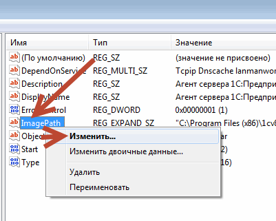 Когда найдем нужную папку в редакторе реестра, ищем (справа) строку «ImagePath». Клик правой кнопкой мышки, и выбираем «Изменить».
