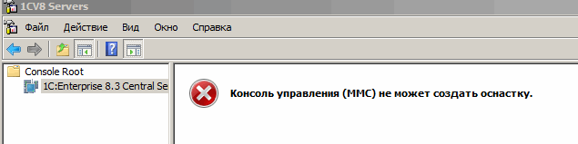 Если после установки Сервера 1С и консоли администрирования серверов, наблюдаем ошибку в консоли: