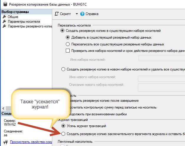 Также мы можем сделать и бэкап «заключительного фрагмента журнала транзакций», если нужно восстановить базу на самый последний момент времени. В таком случаи мы также усекаем журнал (ту часть, что есть на момент создания самого заключительного фрагмента журнала).