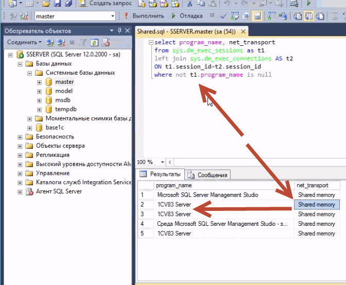 Если видим в колонке «program_name» — 1СV83 Server, а напротив Shared Memory значит уже работает протокол Shared Memory!