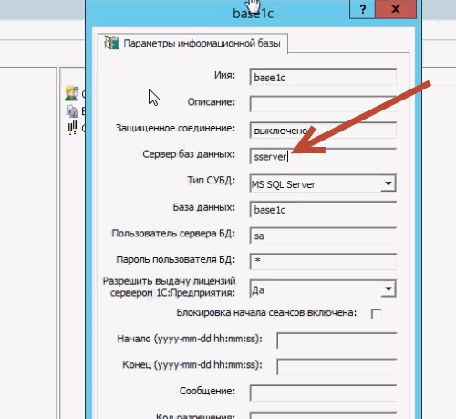 На Сервере 1С (Утилита администрирования Сервера 1С) находим в свойствах информационной базы «Сервер баз данных»