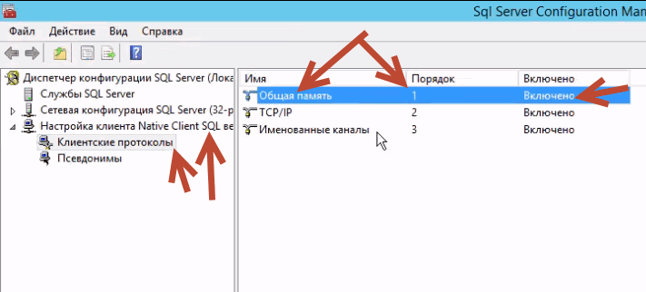 И проверим « Настройка клиента Native Client SQL» — «Клиентские протоколы» — «Общая память» должна быть равна – 1 и конечно «Включена»!