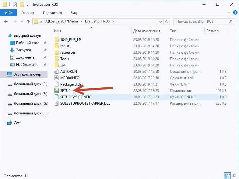 В нашем случаи в каталоге «SQLserver2017Media» клик по иконке «SETUP»