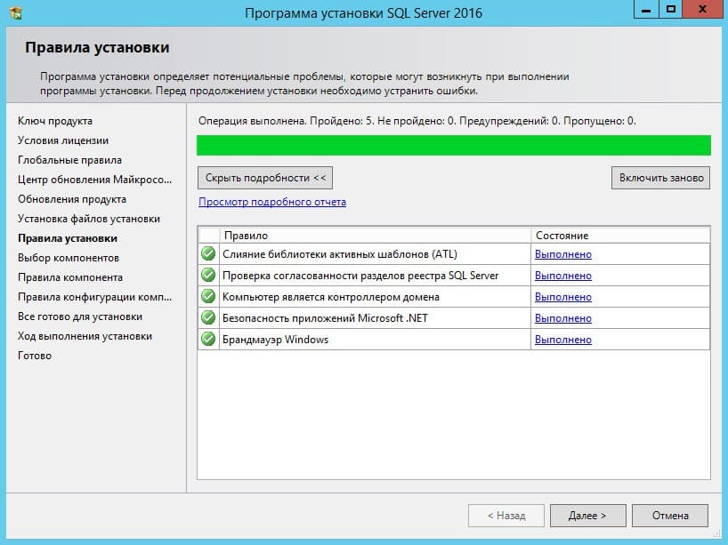 Далее на следующий вкладке установщик проверяет конфигурацию сервера на предмет ошибок, которые не позволят нам установить СУБД . Если у вас как на «скрине» ниже все птички зеленого цвета тогда все отлично и можно продолжать установку, иначе нужно читать и разбираться с проблемами.