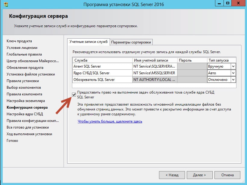 На следующей вкладке ставим птичку: «Предоставить право на выполнение задач обслуживания тома службе ядра СУБД».