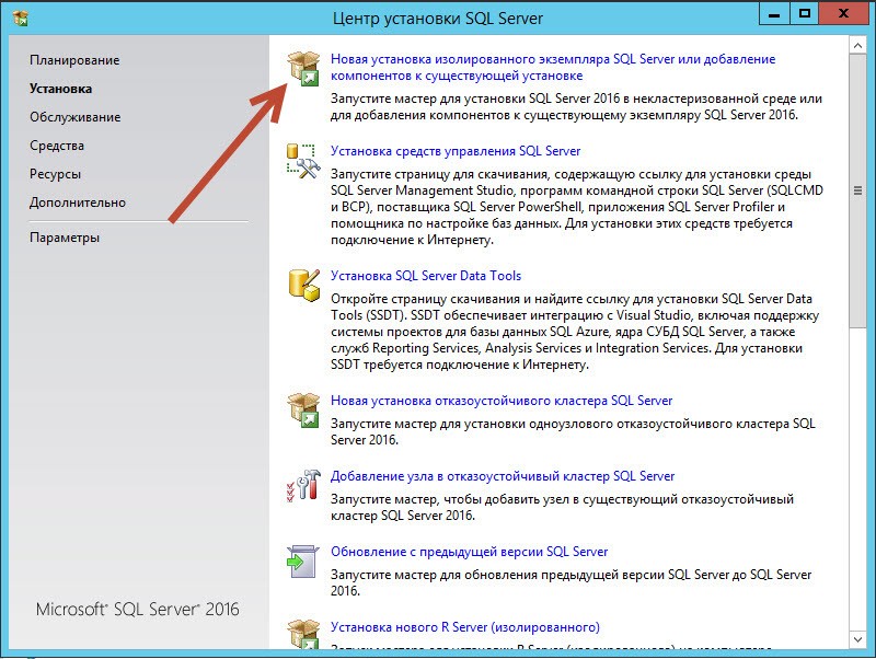 Выбираем вверху «Новая установка изолированного экземпляра SQL server.