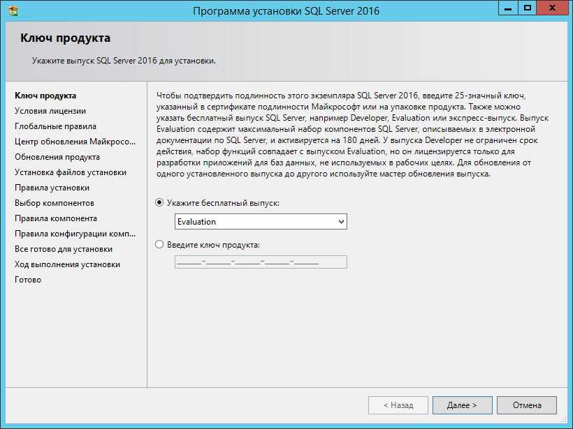 Первым делом на сайте Microsoft нужно скачать веб установщик «сиквела» я брал версию «Evaluation» тестового периода в 180 дней будет более чем достаточно, чтоб оценить версию, и позаботится о лицензировании. Лицензирование довольно простое!