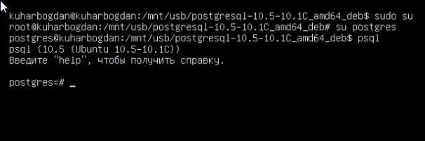 Пишем команду: «sudo su», затем «su postgres» и переходим в оснастку psql командой «psql»