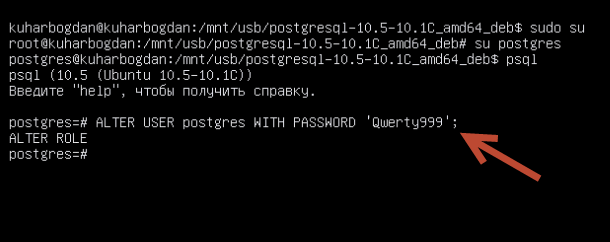 Осталось установить пароль для рута «postgres»