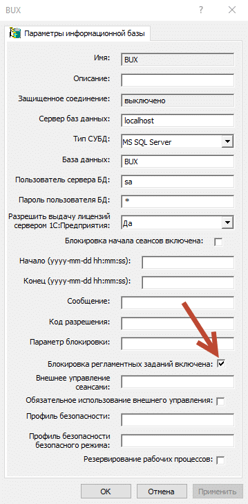 Тогда можно пойти другим путем и в целом на «Сервере 1С» установить «Блокировку регламентных задач» после чего перезапустить «Сервер 1С».