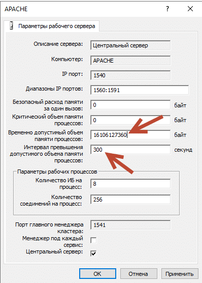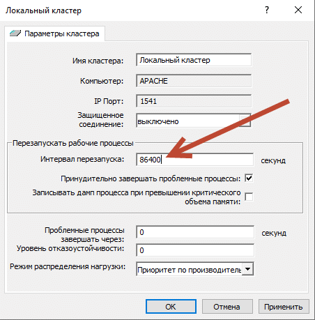 Раз уж мы заговорили о более правильном способе, то он состоит из настроек на перезапуск rphost-a в свойствах «Параметры рабочего сервера» (Только для КОРП!).