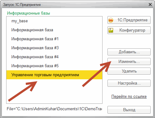Запускаем 1С Предприятие и в окне выбора ИБ выбираем интересующую нас базу для авто запуска и клик по кнопке «Изменить».