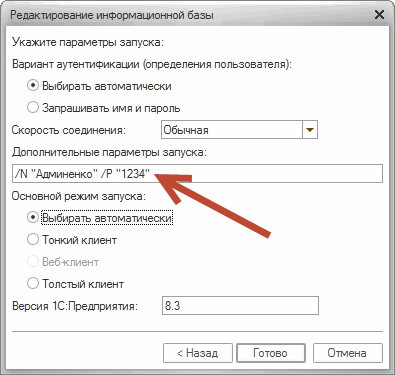 «C:\Program Files (x86)\1cv8\common\1cestart.exe» enterprise /S «Server1S\Torg» /N «Админенко» /P «1234».