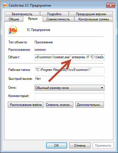 И на этот раз мы их пропишем в самом ярлыке 1С.